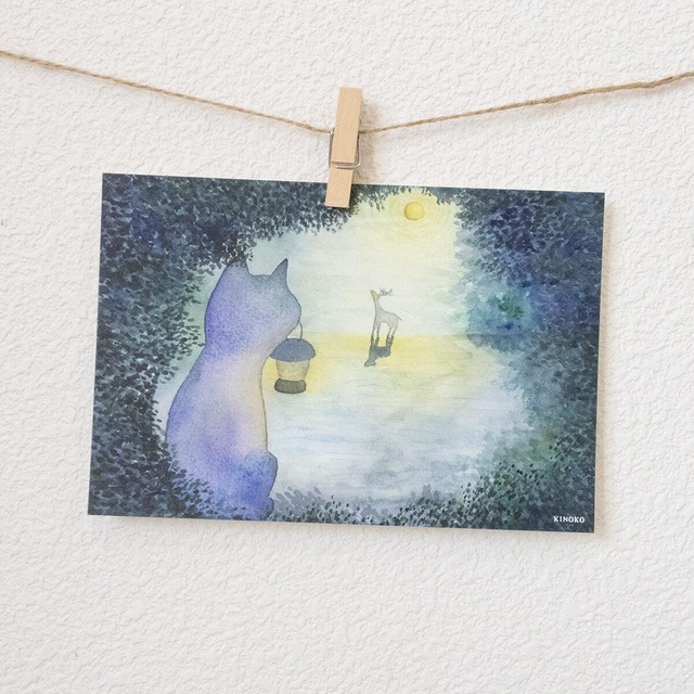 ポストカード 夜の森の風景 / グッズ 水彩 イラスト 猫 幻想 絵本風