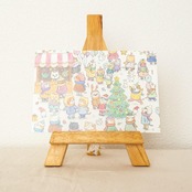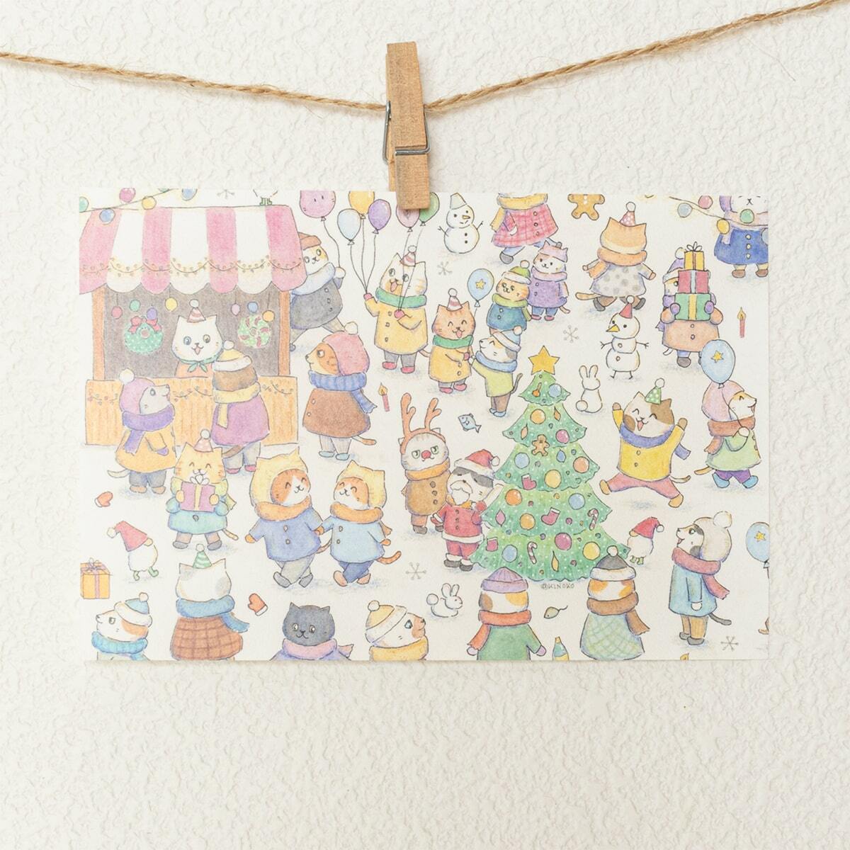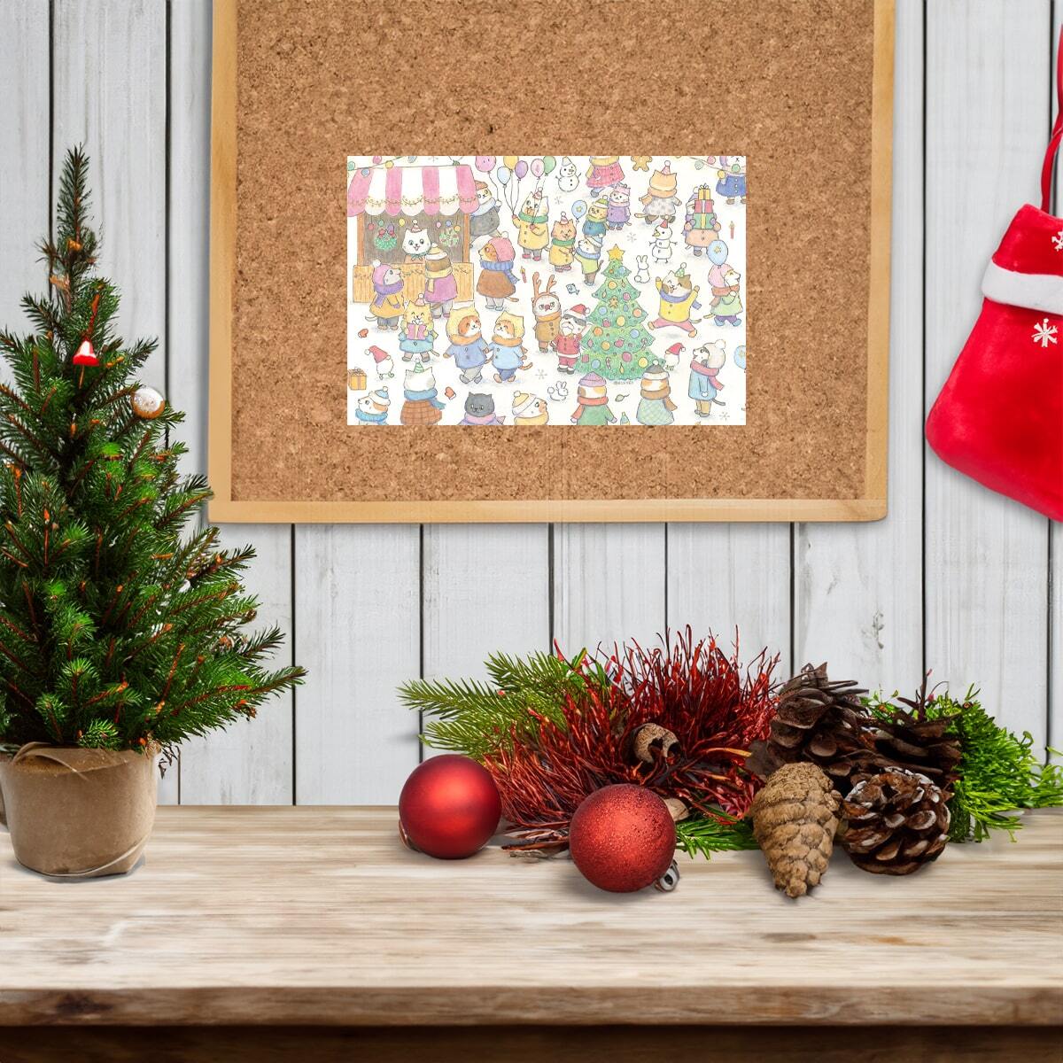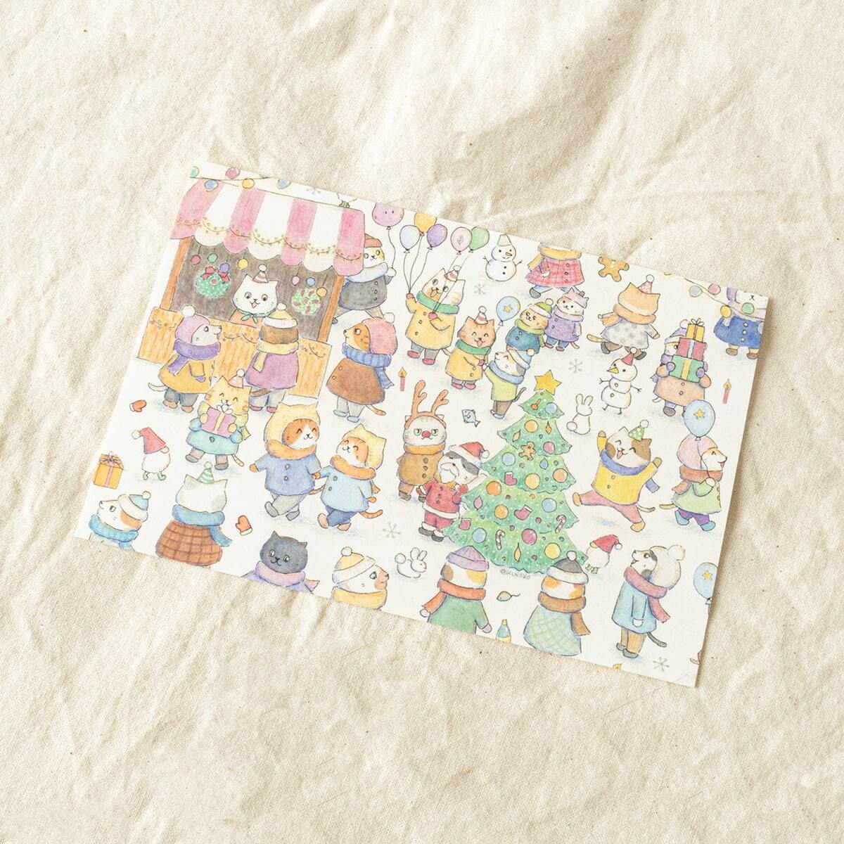 クリスマスマーケットの猫たちの様子が描かれたポストカード。