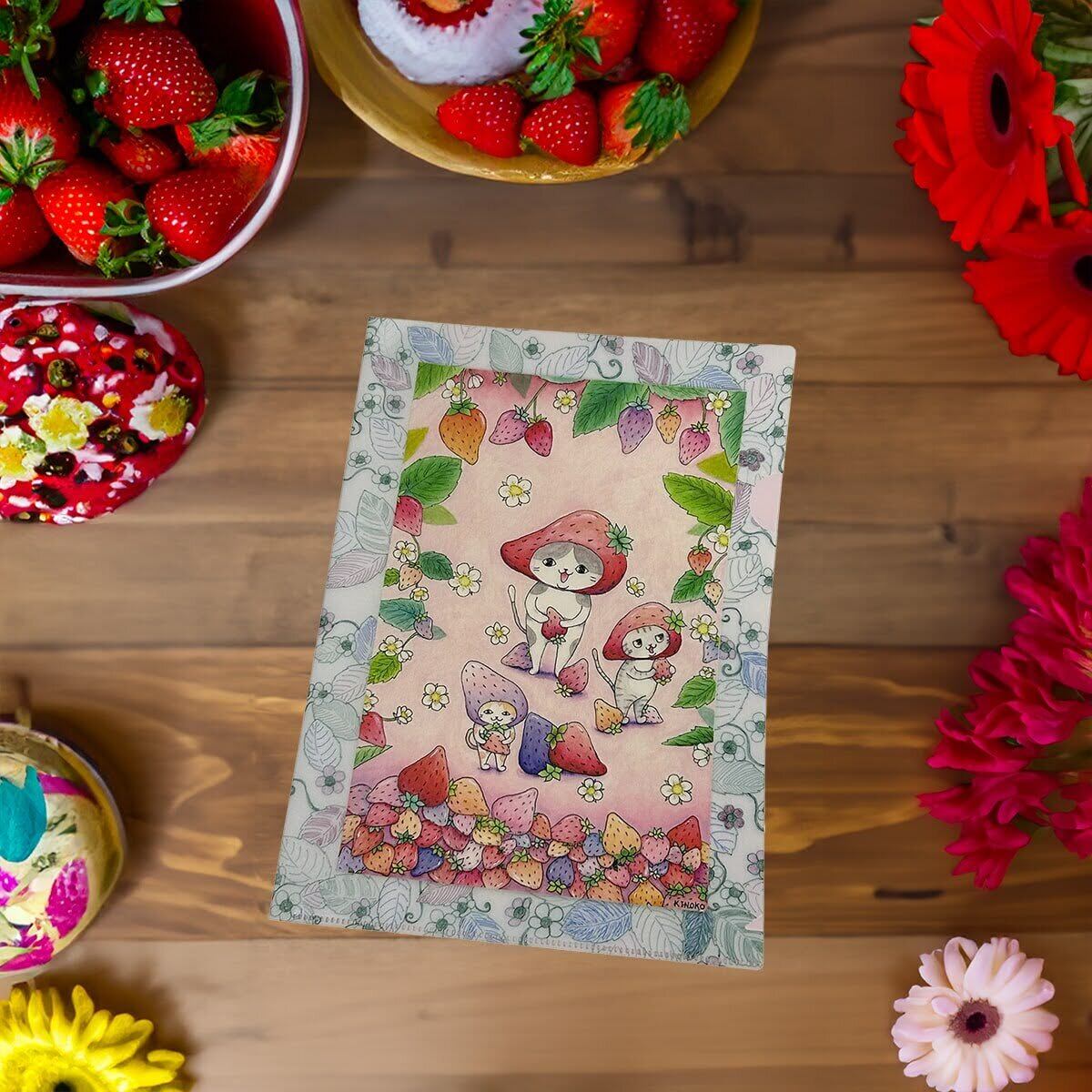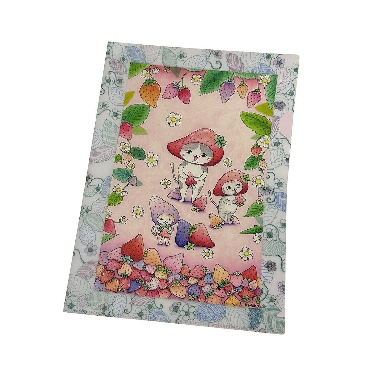 いちごのかぶりものを被ったハチワレ猫が描かれたA4サイズのクリアファイル。