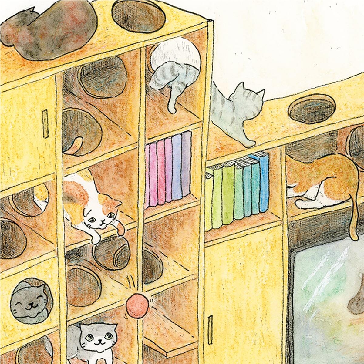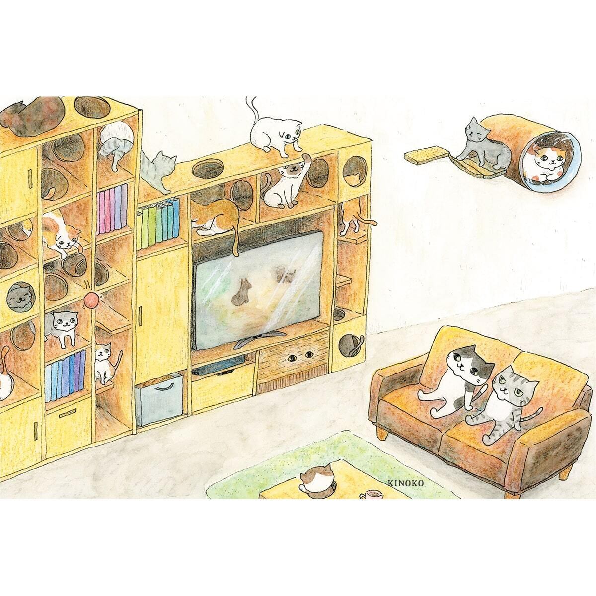 猫好きにはたまらないデザインで、愛らしい猫たちのいる理想の猫部屋が描かれています。