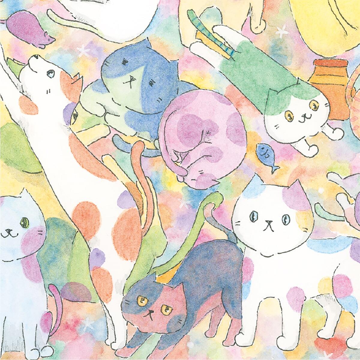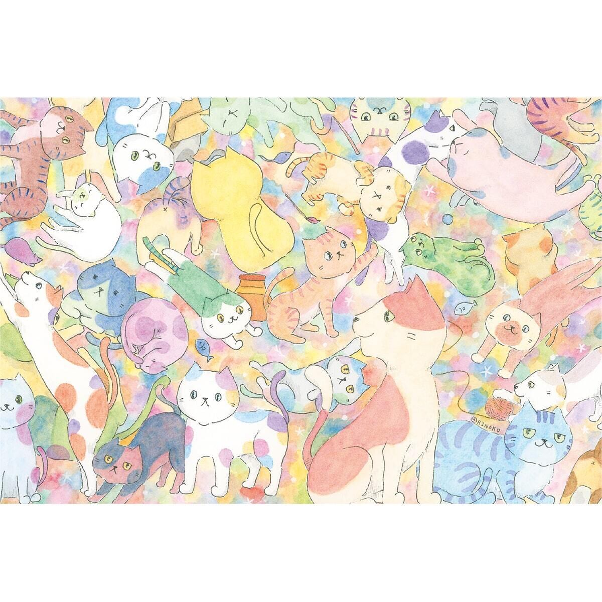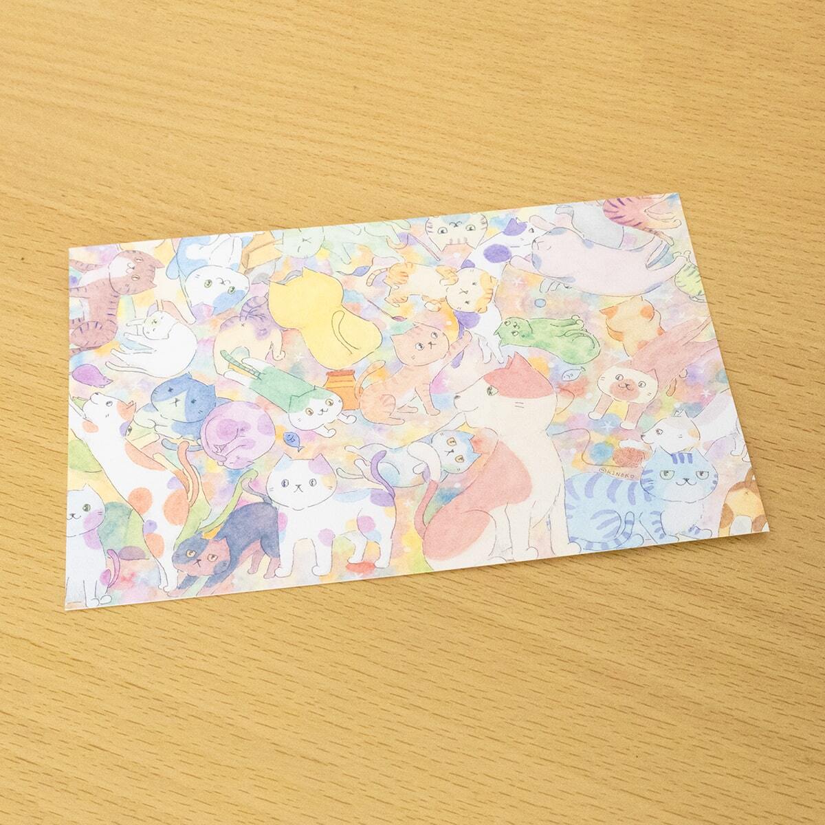 愛らしい猫たちが元気に集まる、癒しのポストカードです。