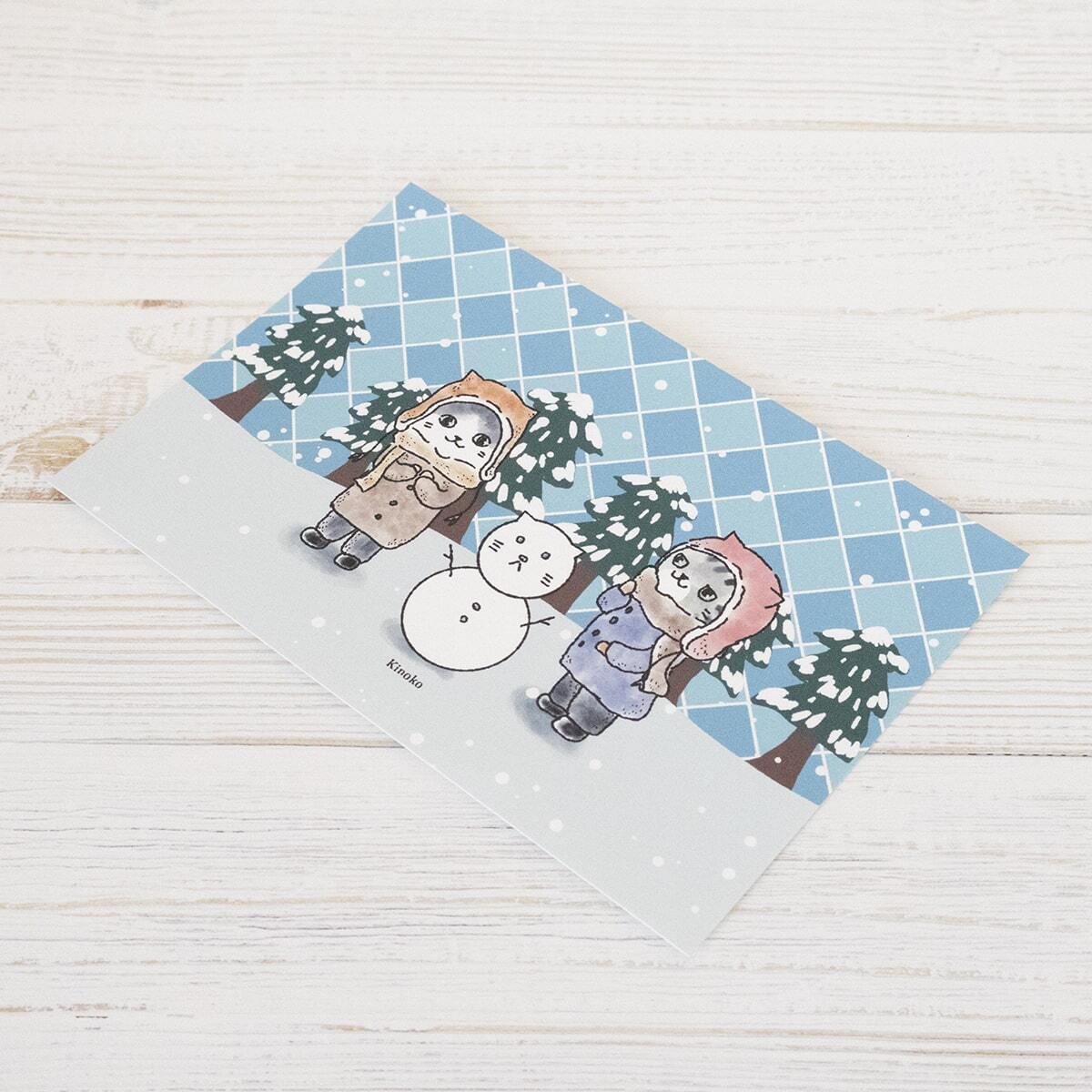 心癒される冬の風景で、猫たちが雪だるまを作って遊ぶ、可愛らしいポストカードです。