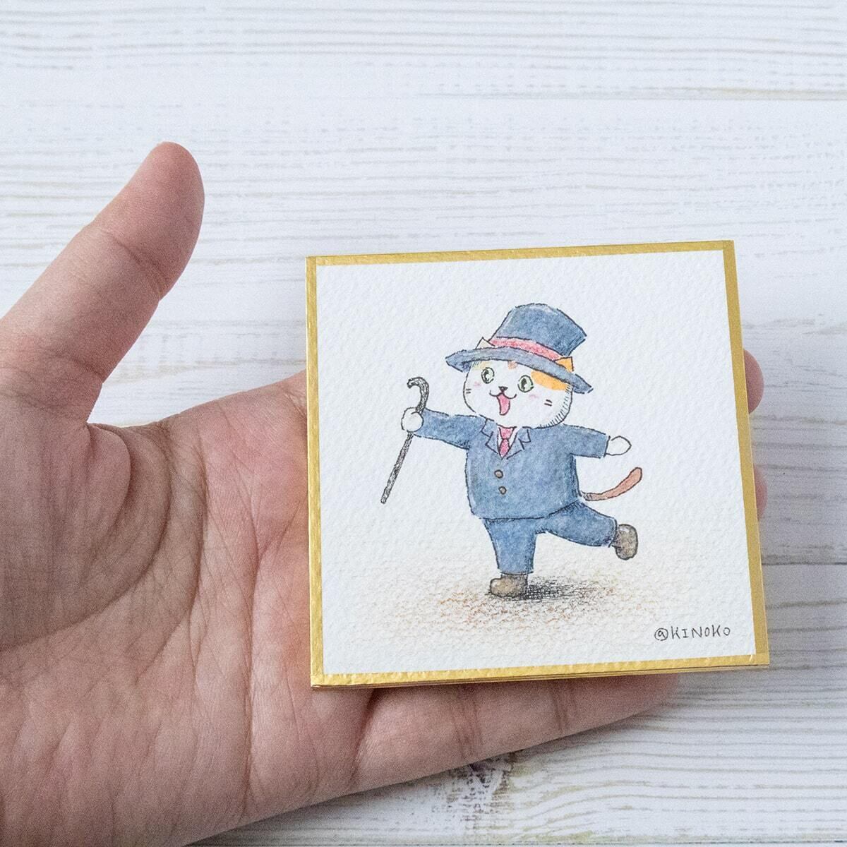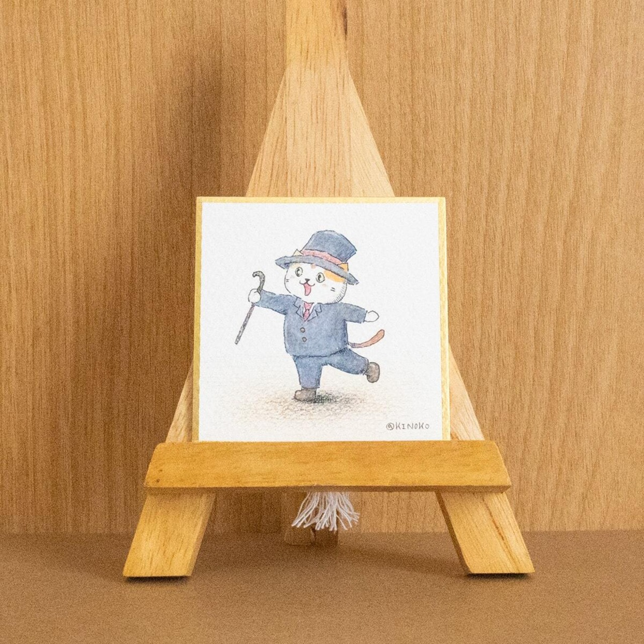 心癒される華やかなシーンで、シルクハットとタキシードを身にまとった猫が一歩を踏み出す、愛らしいミニ色紙です。