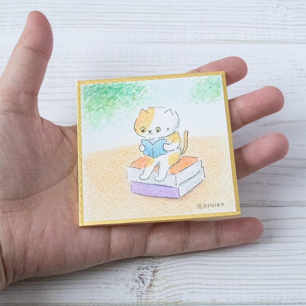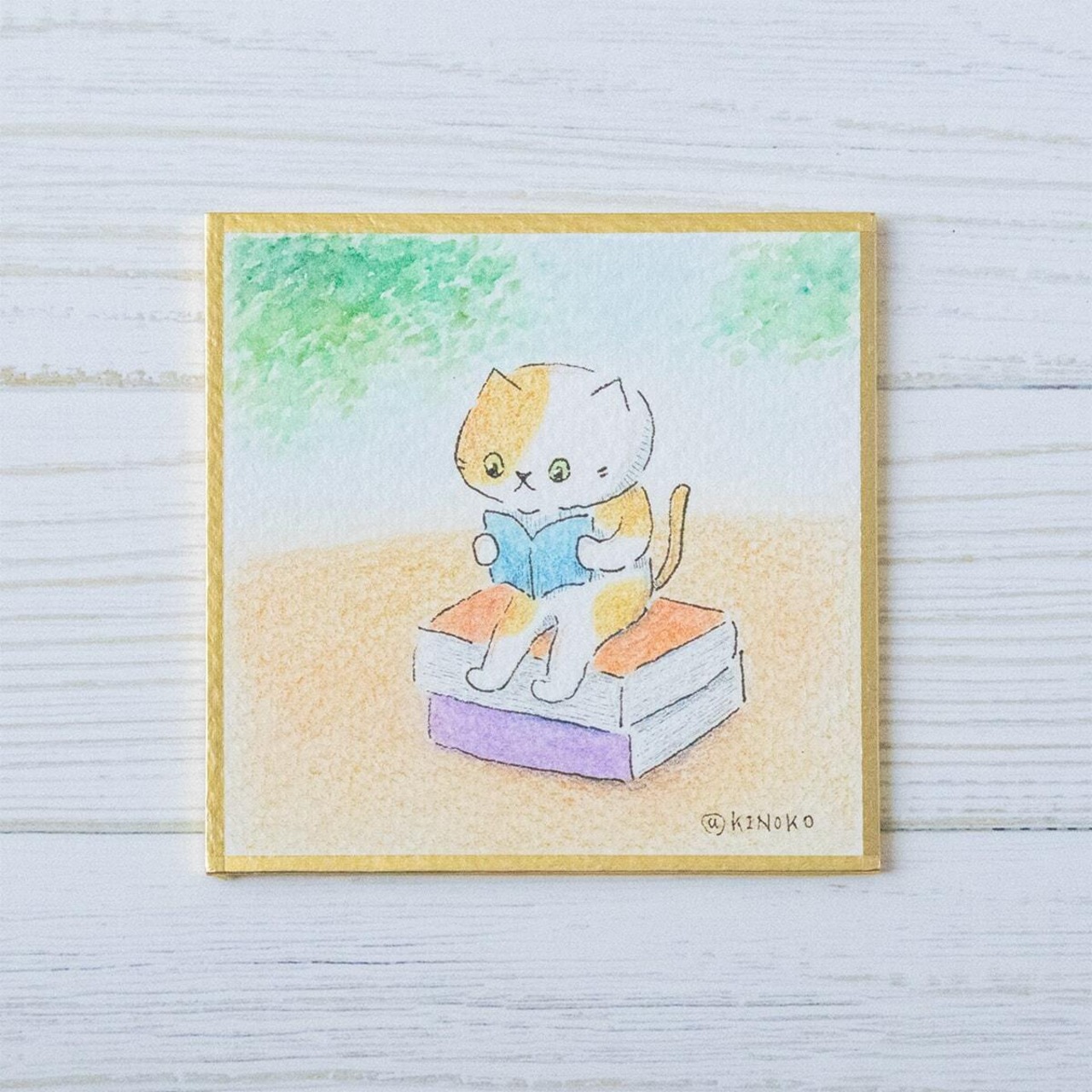 心癒される読書のひとときで、本の上でゆっくりと読書する猫の姿が愛らしいミニ色紙です。