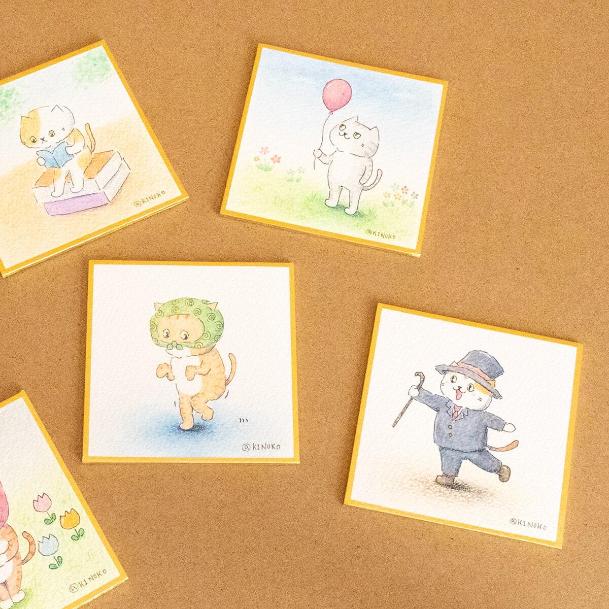 心癒されるナチュラルな風景で、嬉しそうに風船を持つ愛らしい猫が描かれた、魅力的なミニ色紙です。